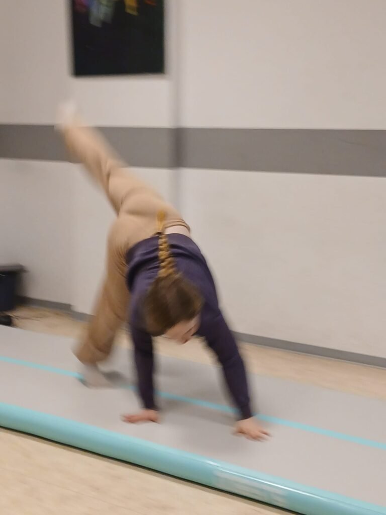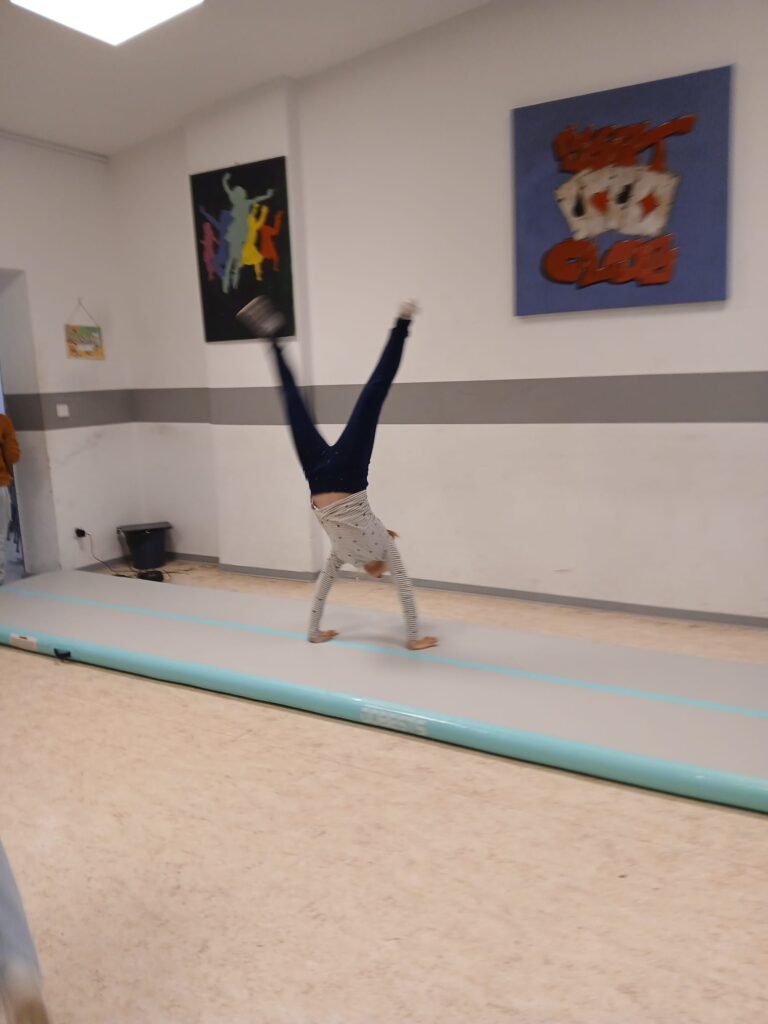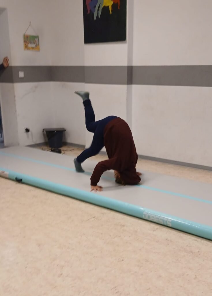 Mit der AirTrack‑Matte können verschiedene Elemente ausprobiert werden: Rollen, Handstand‑Ansätze, kleine Sprünge oder Balancieren in Kombination mit anderen Geräten. Dadurch wird neben Kraft vor allem auch Koordination, Gleichgewicht und Körperspannung gefördert.