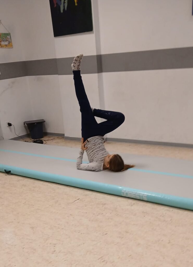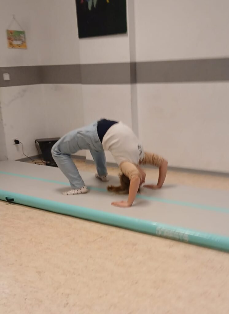 Die neue AirTrack‑Matte ist bei den Kindern gerade total angesagt. Sie ist eine aufblasbare, weiche Matte, auf der man laufen, springen, balancieren und akrobatische Bewegungen üben kann. Durch ihre federnde Oberfläche wird die Landung weich – das macht nicht nur Spaß, sondern gibt den Kindern auch Sicherheit beim Üben von Bewegungen.