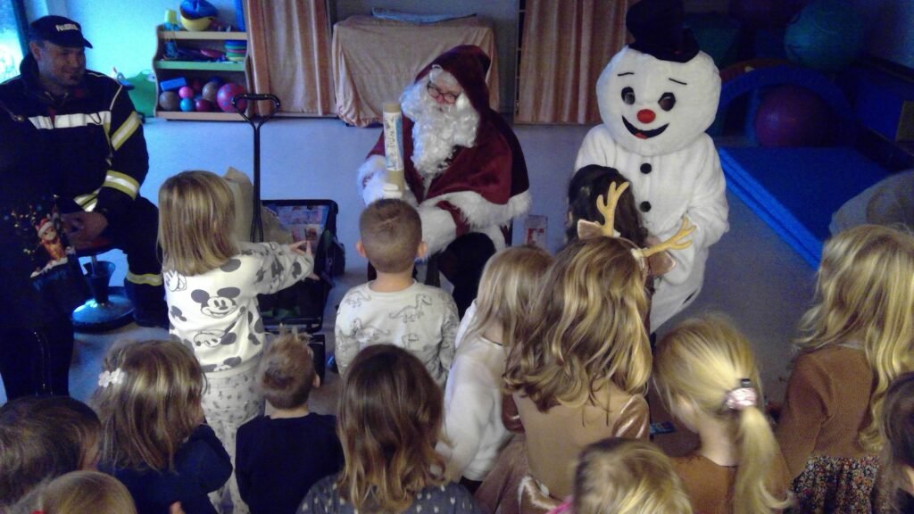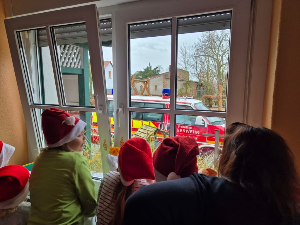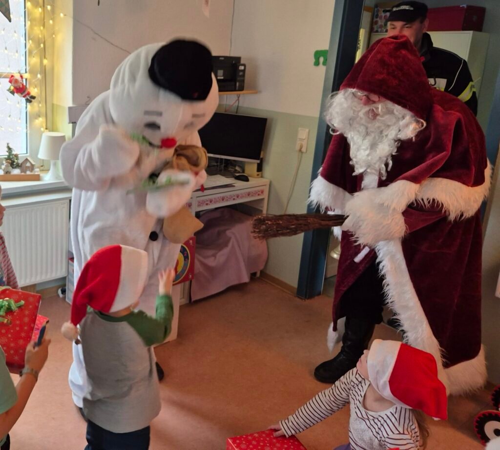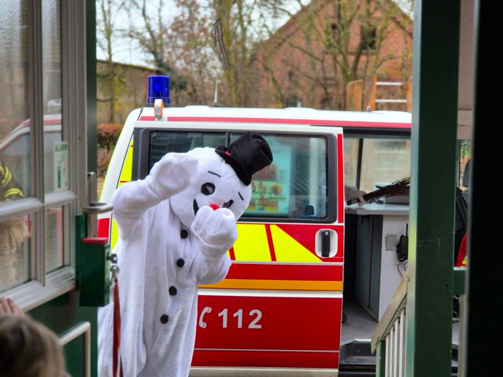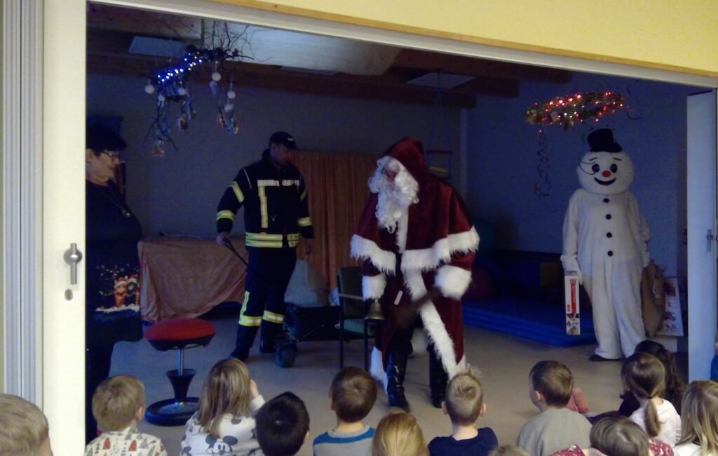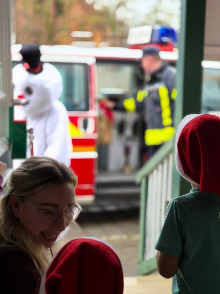 Mit einem Mal wurde es draußen richtig laut. Die Feuerwehr fuhr vor – mit Blaulicht und Sirene. Die Kinder drückten neugierig ihre Nasen an die Fenster, doch schnell war klar: Es brennt nicht. Und trotzdem wurde es richtig rot. Denn aus dem großen Feuerwehrfahrzeug stieg in vollem Glanz niemand Geringerer als der Weihnachtsmann. An seiner Seite war sein fröhlicher Begleiter, der Schneemann Olaf.